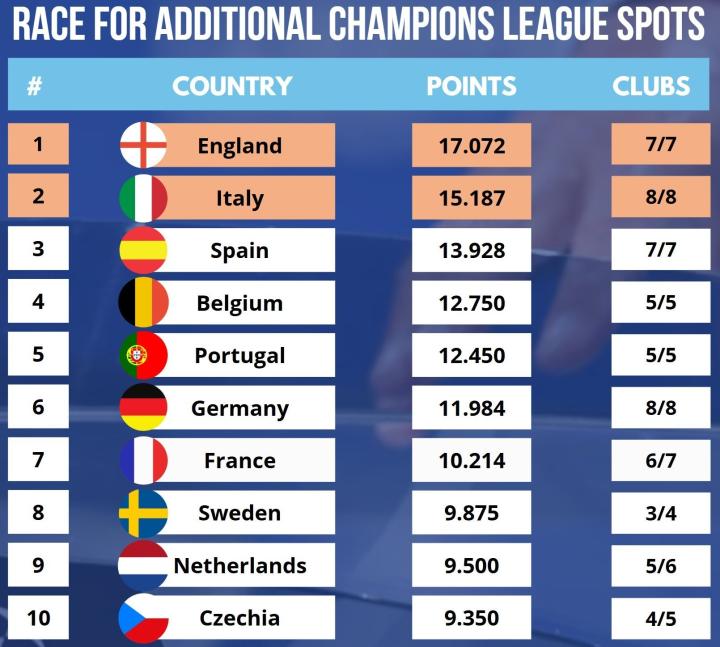 德国目前排名第六,战绩不佳,仅以11.984分参赛,法国以10.214分排在第七,瑞典、荷兰和捷克分列之后。这些积分榜的变动可能会对下赛季欧冠资格产生重大影响。